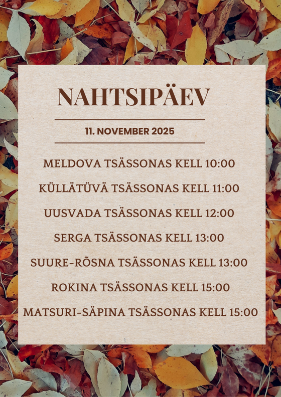 11. novembril nahtsipäiv Meldova tsässonas kell 10, Küllätüvä tsässonas kell 11, Uusvada tsässonas kell 12, Serga tsässonas kell 13, Suure-Rõsna tsässonas kell 13, Rokina tsässonas kell 15, Matsuri-Säpina tsässonas kell 15
