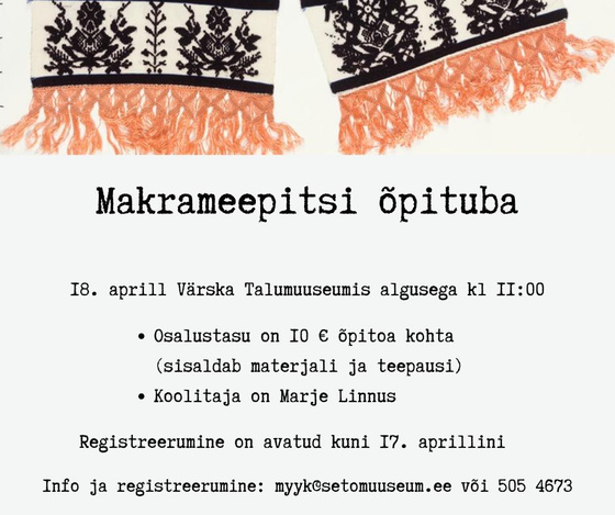 18. aprillil kell 11 makrameepitsi õpituba Värska talumuuseumis