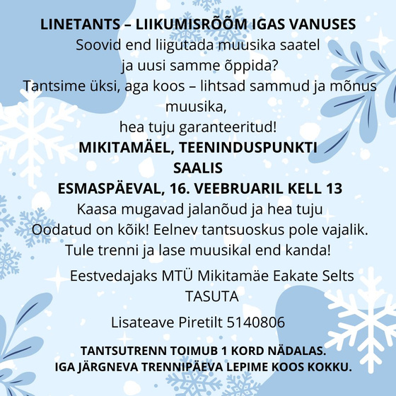 16. veebruaril kell 13 Linetantsu trenn Mikitamäe teeninduspunkti saalis