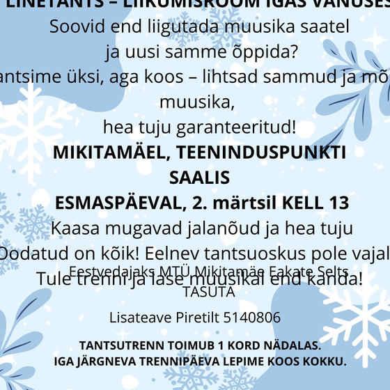 2. märtsil kell 13 Linetantsu trenn Mikitamäe teeninduspunkti saalis