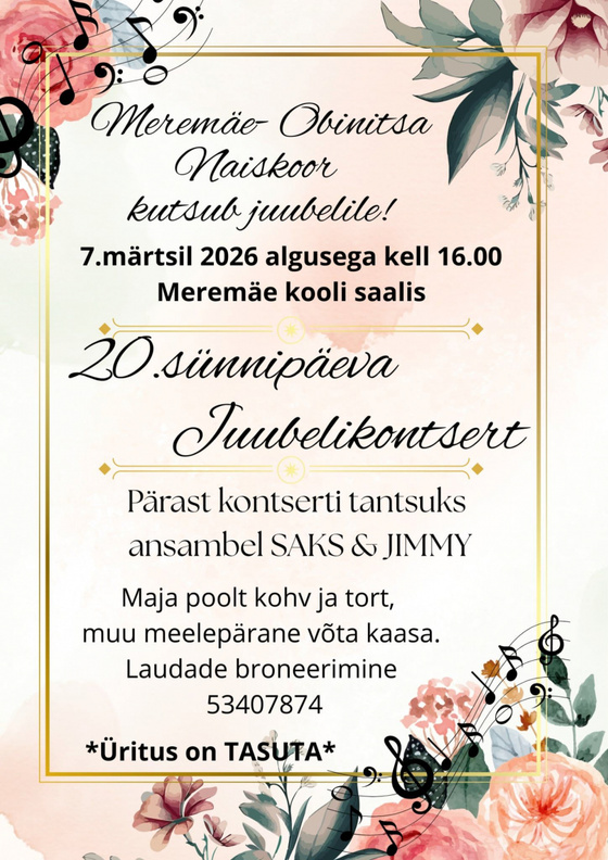 7. märtsil kell 16 Meremäe-Obinitsa Naiskoor MONK 20.juubelikontsert Meremäe kooli saalis