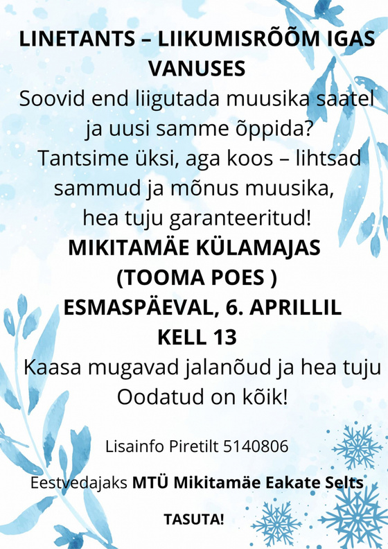 6. aprillil kell 13 linetantsu trenn Mikitamäe külamajas (Tooma poes)