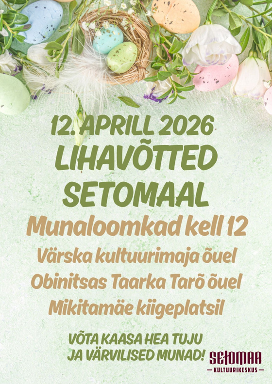 12. aprillil kell 12 lihavõtted Värska kultuurimaja õuealal, Obinitsas Taarka Tarõ õuel ja Mikitamäe kiigeplatsil