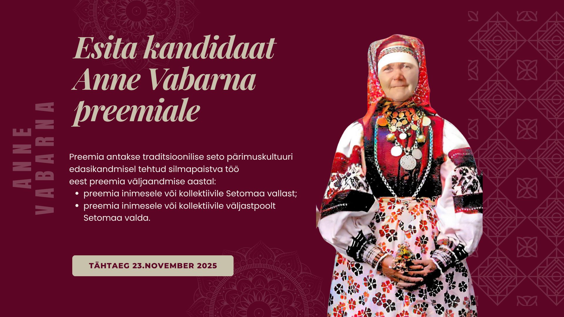 Anne Vabarna omakultuuri õhtu15.12.2025 16:00Värska KultuurimajaAnne Vabarna omakultuuripreemia õhtu Värska Kultuurimajas kell 16:00 Hingepalve Anne Vabarna haual Värska kalmistul kell 15:00 Tagasi